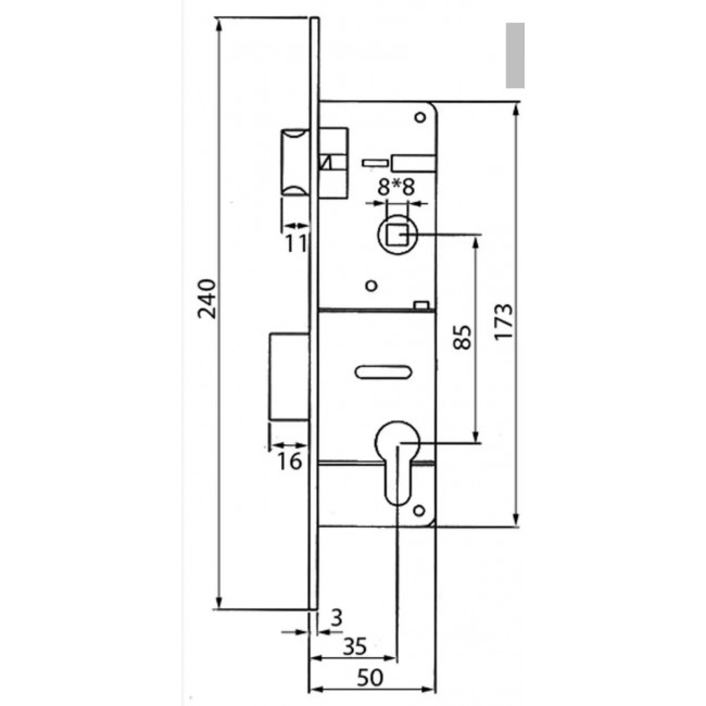 Корпус замка USK PLC8535 (ширина лицевой планки - 22мм) предназначен для установки на двери из металлопластикового и алюминиевого профиля.