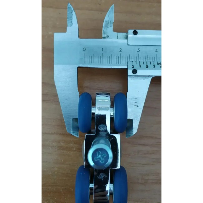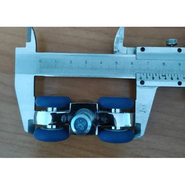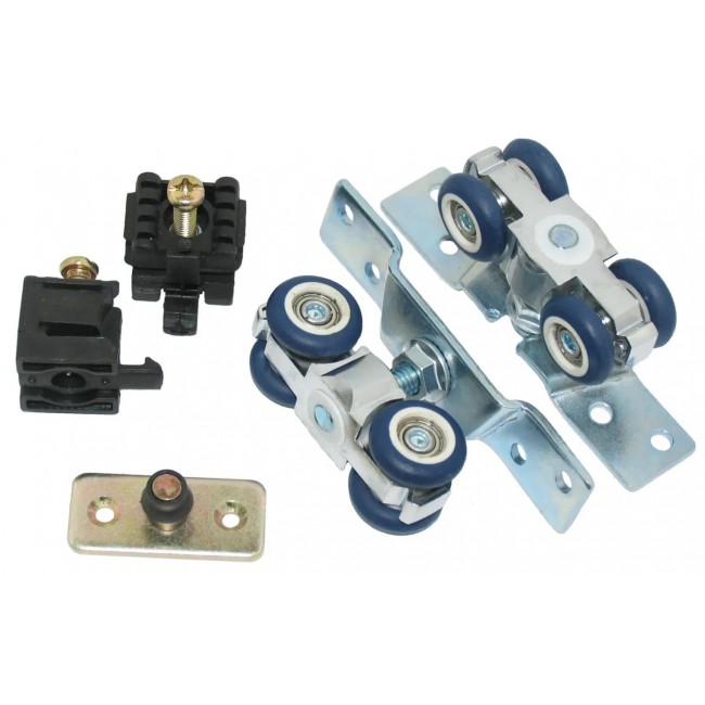 (роликовая каретка, которую закрепляют на верхний торец дверного полотна; ролики изготовленные из специального полимера, устойчивого к стиранию; ролики вращаются на подшипниках качения, что обеспечивает легкий и плавный ход. Так же при монтаже с помощью винта механизма можно регулировать зазор между нижней частью дверного полотна и полом)
