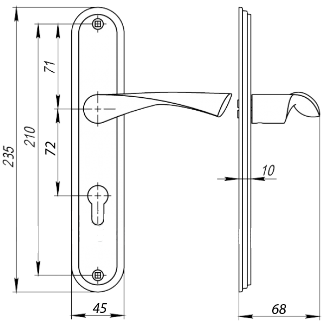 Ручки на планке 72/40-012 предназначены для установки на входную металлическую или деревянную дверь в комплекте с цилиндрическими замками.