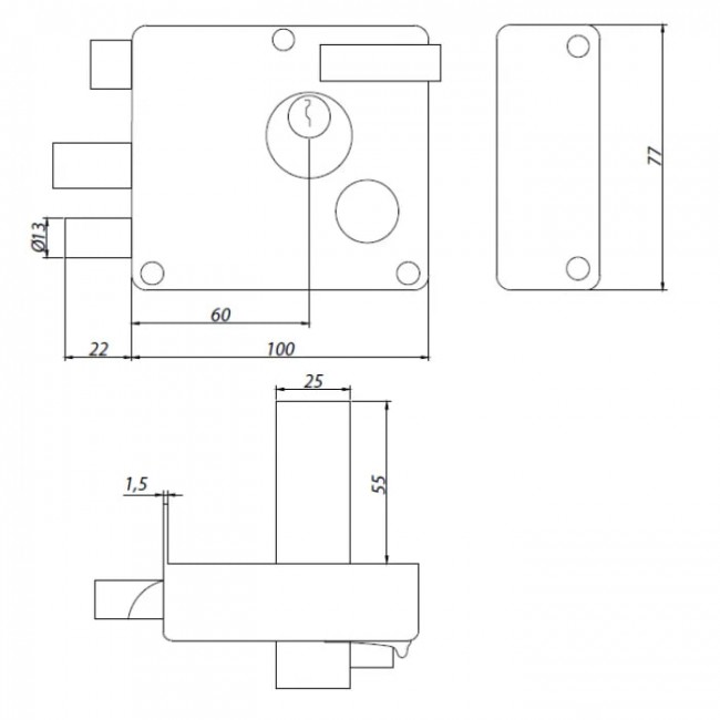 Накладний замок для дерев'яних і металевих дверей товщиною до 55 мм.