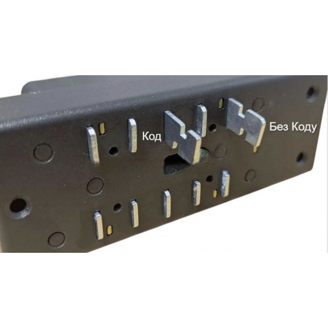 Для смены кода необходимо отвернуть 4 винта и снять блок пружин с рычагом. Кодирование замка осуществляется установкой сувальда в корпус замка в определенном положении: сувальда кодовых кнопок должны быть установлены скосом в направлении к оси замка. Сувальда неходовых кнопок должны быть установлены скосом в направлении от оси замка.