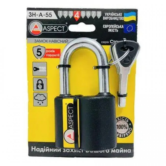 Замок навесной ASPECT (Аспект) ЗН-А-55 6кл — это надежное запорное устройство украинского производства, предназначенное для охраны гаражей, калиток, ворот и складских помещений. Его главной особенностью является комплектация 6 ключами, что удобно для коллективного доступа.