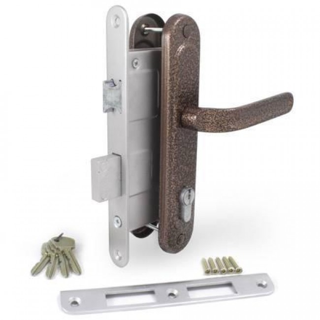 Замок врезной Мотор Сич-ЗВ-7-с ручками медь. Замок предназначен для деревянных и металических дверей жилых и общественных помещений. Замок закрывается на засов с обеих сторон поворотом ключа. Защелка открывается как при помощи ручки, так и при помощи ключа. Замок универсальный, может устанавливаться на двери левого и правого открывания. Цилиндр ключ/ключ 70 35/35мм
