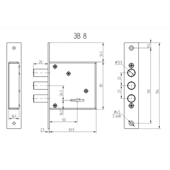 Размеры замка: 85 x 85 x 18 мм.