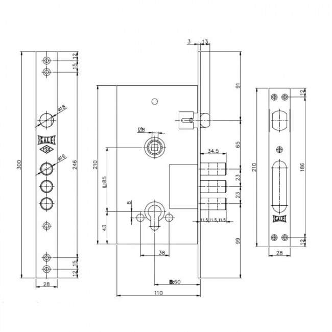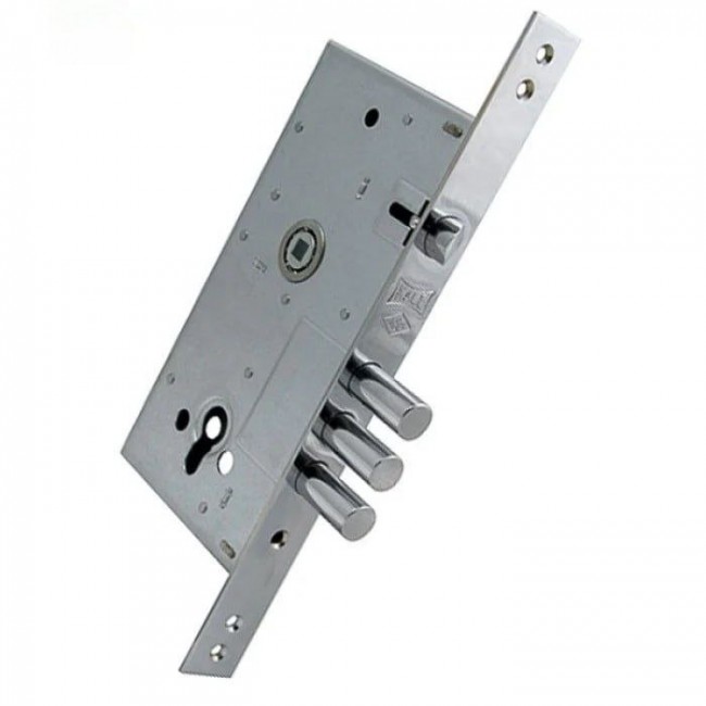 Замок врезной цилиндровый серии 252R имеет 4 класс взломостойкости. Предназначен для установки в металлические двери. С переустанавливаемой защелкой диаметром 18 мм. Без задвижки. С прямоугольной лицевой планкой 3 мм. Дверной замок KALE серии 252 R оснащен тремя стальными ригелями вылетом в 3 оборота 34.5 мм, диаметром 16 мм, нажимной защелкой. Механизм вылета ригелей трехшаговый, позволяет закрывать замок на 1 - 3 оборота. Замок имеет гальваническое покрытие для защиты при использовании в агрессивной среде. Защелка отпирается с обеих сторон ручкой или ключом. Узел защелки оснащен подшипником, это делает более мягким нажатие при отводе защелки. Узел защелки имеет функцию переворота язычка, как на левую, так и на правую стороны. Межосевое расстояние 85 мм. С бэксетом 60 мм, без ответной планки, без декоративных накладок на ключевину.
