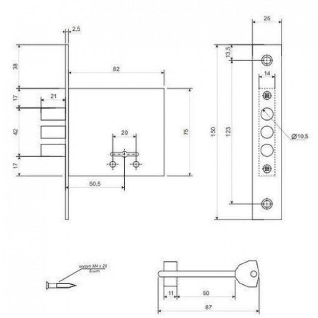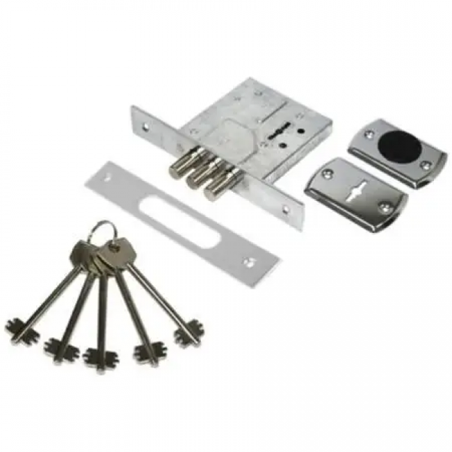 Врезной замок для деревянной двери. По обе стороны открывается ключом. В комплект входят декоративные накладки, комплект крепежа, ключи 5шт.